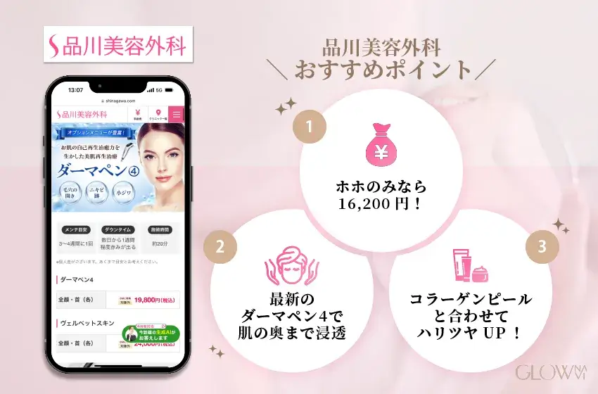 品川美容外科は、全国に39院を展開している美容クリニック。ダーマペンは、頬・首といったパーツの指定や、5cm×5cmという範囲の指定が可能です。