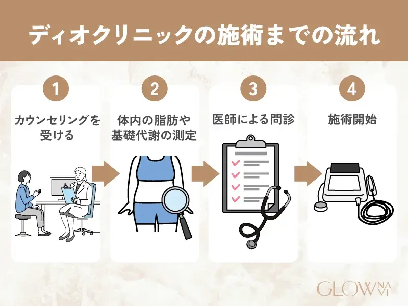 医師による説明が終わったら、決定したプランに基づいて施術スタートです。ディオクリニックでは、患者によってオーダーメイドのプログラムでダイエットをするので、実施する内容は人によって異なります。