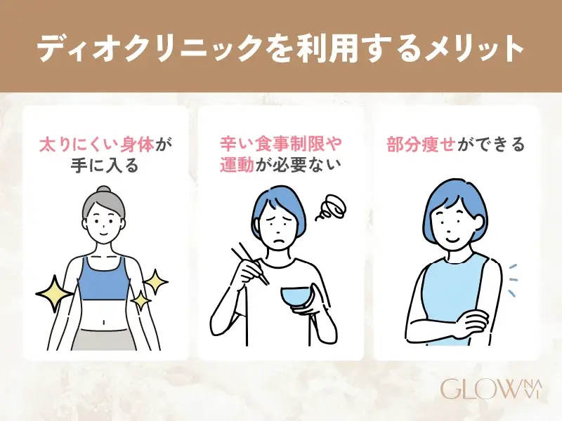 ここでは、公式サイトの情報や口コミをもとに、ディオクリニックを利用するメリットを3つ紹介します。紹介するメリットは次のとおりです。