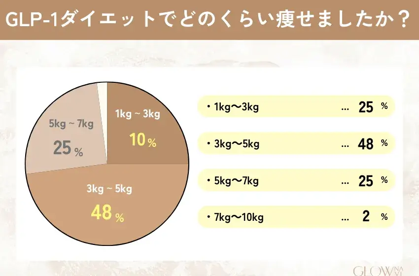 GLP-1によって「3kg~5kg」ほど痩せたという回答が最も多い結果でした。今回のアンケートでは、7kg以上痩せたという方はほとんどいませんでした。