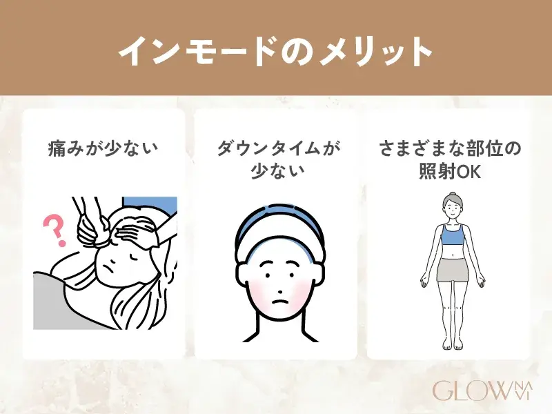 インモードは、施術時の痛みが少なめです。個人差はあるものの、軽い熱感がある程度なので、痛みが苦手な人にも向いています。