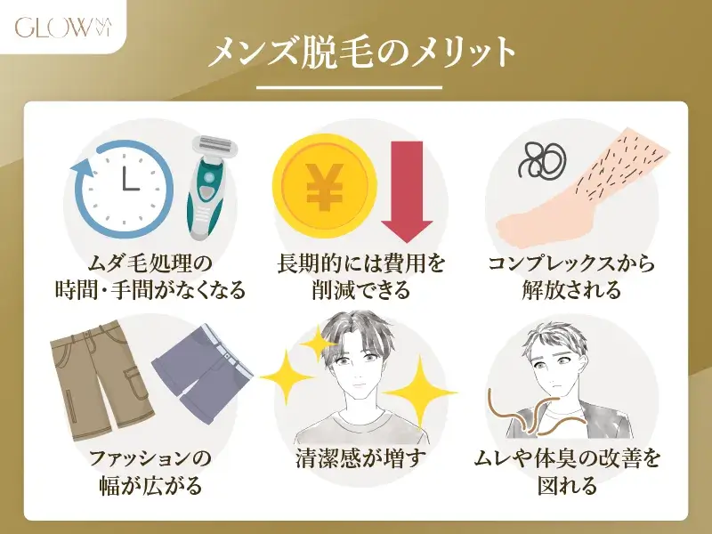 男性が脱毛するメリットとして、ムダ毛処理の時間や手間をなくせたり、清潔感を高めたり、体臭を改善できたりするということが挙げられます。他にも、ファッションの幅が広がるなどといった理由から近年急速にその需要を高めています。