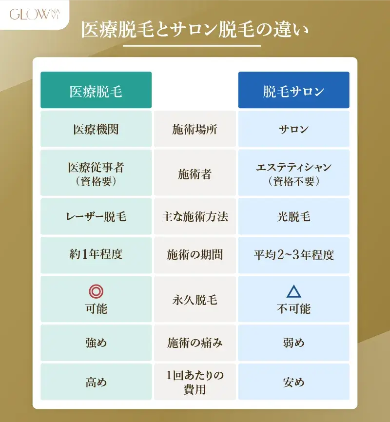 大きく違う点は、施術者の資格の有無です。医療脱毛は医療機関であるため、施術が可能なのは資格を持った医療従事者です。一方脱毛サロンは資格のないスタッフでも施術することができます。医療脱毛は、医療機関であることからより出力の高いマシンを使用することができ、永久脱毛も可能となります。