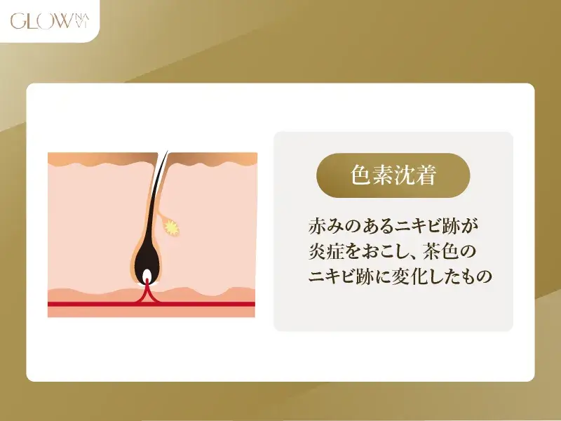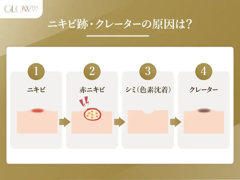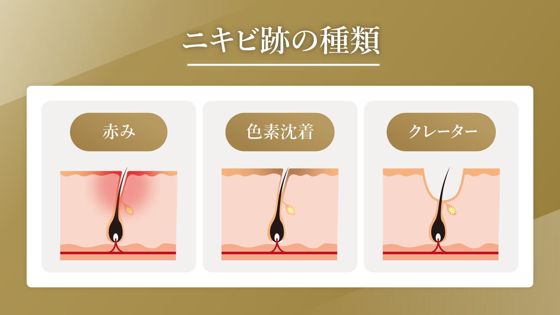 - ニキビ跡の種類は、赤み、色素沈着、クレーターの3種類