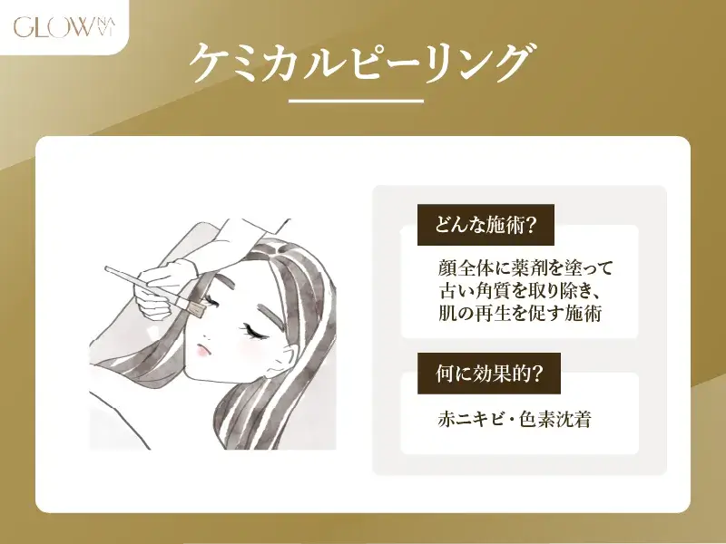 ケミカルピーリングとは、肌のターンオーバー促進を目的とした施術です。肌に特殊な薬剤を塗り込み、古い角質を取り除くことでターンオーバーを促します。